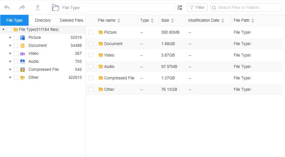 Alat za oporavak podataka WorkinTool može oporaviti izbrisane podatke koji dolaze u svim vrstama datoteka s osobnog i prijenosnog računala koje koristi operacijski sustav Windows 11/10/8/7. On nudi filter datoteka kako biste se mogli precizno fokusirati samo na onu vrstu datoteke koju želite vratiti. Najčešće su to ovi tipovi i formati datoteka: