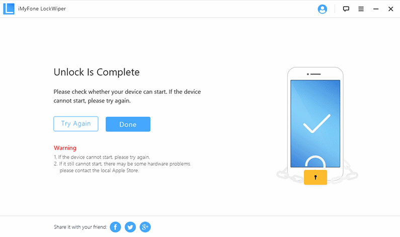 Ako se ne možete sjetiti lozinke, ili je iPhone, iPad ili iPod razbijen, a važno vam je doći do podataka, otključajte lako vaš uređaj kroz samo 3 jednostavna koraka. iMyFone LockWiper može uspješno otključati iPhone, iPad ili iPod, da pristupite uređaju i naprvite sve što je potrebno dalje. Naknadno možete promijeniti lozinku, napraviti Factory Reset, pa i formirati novi Apple ID da se prijavite na Apple servise s novim pristupnim podacima.